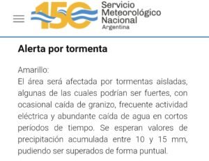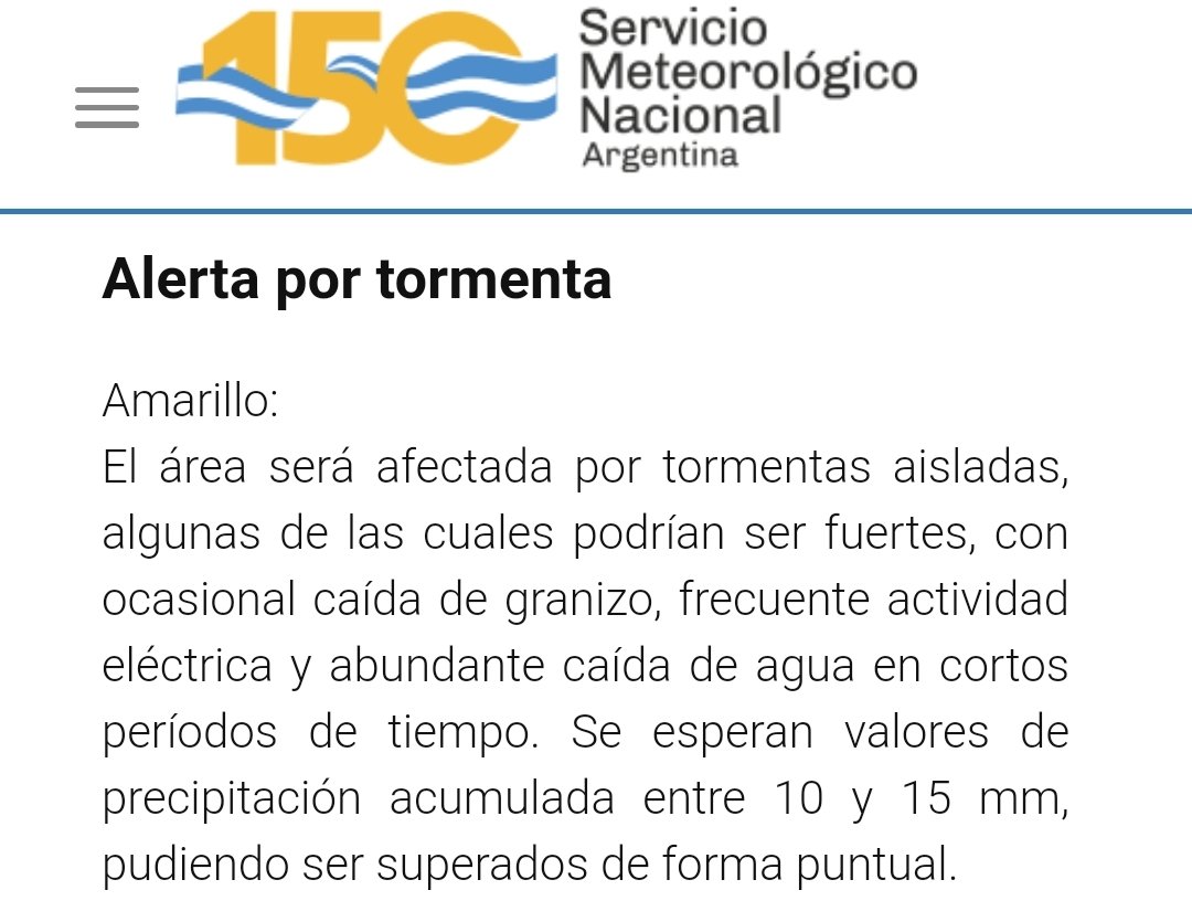 «El área será afectada por tormentas aisladas, algunas de las cuales podrían ser fuertes, con ocasional caída de granizo, frecuente actividad eléctrica y abundante caída de agua en cortos períodos de tiempo. Se esperan valores de precipitación acumulada entre 10 y 15 mm, pudiendo ser superados de forma puntual».