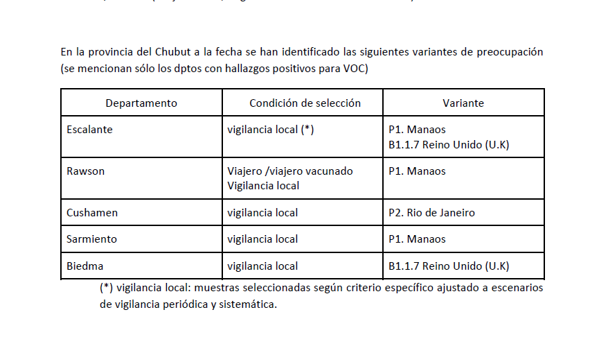 Así lo confirmó hace instantes el Ministerio de Salud de la provincia de Chubut . En el Departamento de Escalante, circula la denominada P1 Cepa Manaos y la B1.1.7 Cepa del Reino Unido.