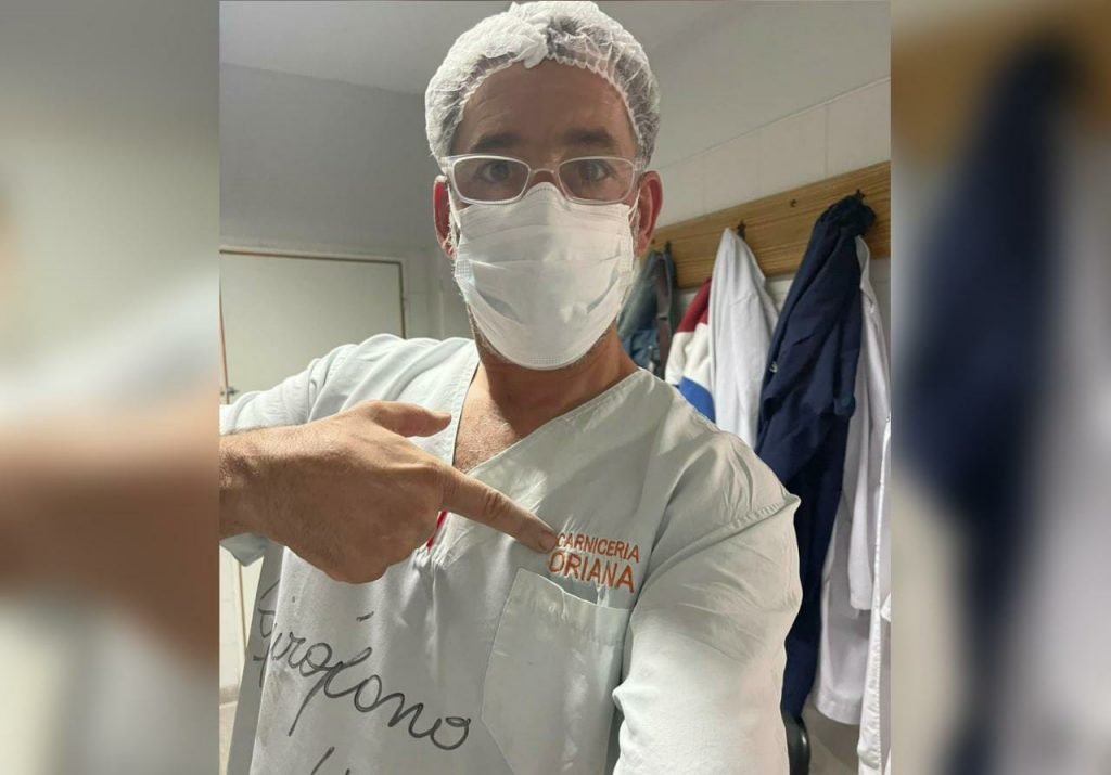 El Dr. Gustavo Parera en sus redes sociales viralizó la curiosa vestimenta de los médicos: “lindos ambos del Hospital Regional”. En la imagen que acompaña el posteo se lo ve vestido para realizar sus tareas y señalando la inscripción que reza “Carnicería Oriana”, evidenciando la falta de uniformes indicados para el personal.