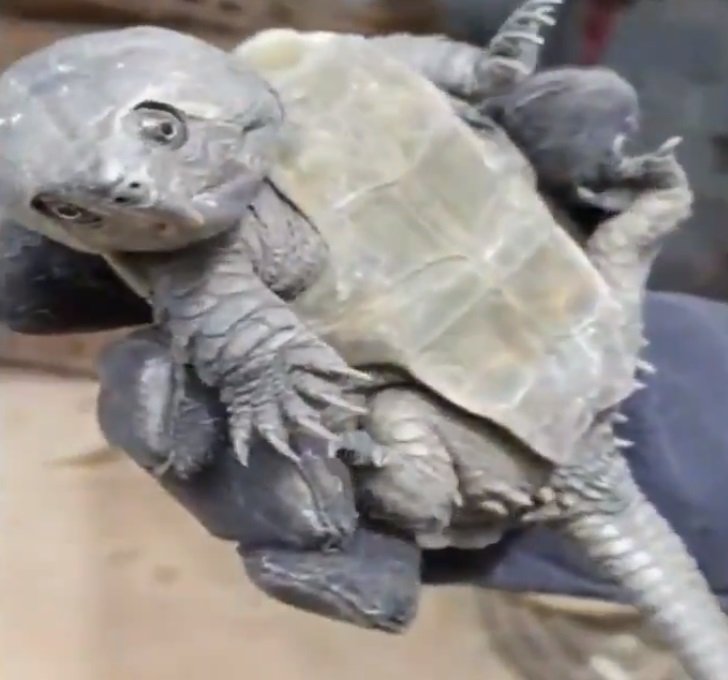 La extraña tortuga que hallaron en China con pico de águila y cola de cocodrilo.