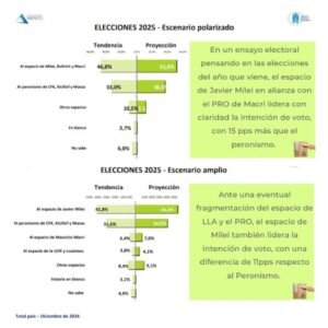 Así lo difundió la consultora Aresco, que dirige Federico Aurelio, “en un ensayo electoral pensando en las elecciones del año que viene, el espacio de Javier Milei en alianza con el PRO de Macri lidera con claridad la intención de voto, con 15 puntos porcentuales más que el peronismo”, indicó el informe final correspondiente a diciembre del Estudio sobre contexto sociopolítico y socioeconómico que elabora Aresco, frente a un escenario polarizado entre dos grandes espacios, donde el sector Milei-Bullrich-Macri se quedarían con entre el 46,8% al 51,8% de proyección; y el panperonismo con entre el 33% y el 35,5%. “Ante una eventual fragmentación del espacio de La Libertad Avanza y el PRO, el espacio de Milei también lidera la intención de voto, con una diferencia de 11 puntos porcentuales con respecto al Peronismo”, indicó el trabajo, exponiendo que el espacio de Mauricio Macri solo obtendría entre el 6,4% y el 7% si fuera con lista propia.
