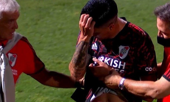 Sentado en el banco de suplentes, el capitán riverplatense lloró desconsoladamente por una lesión que podría demandarle al menos tres meses de recuperación.
