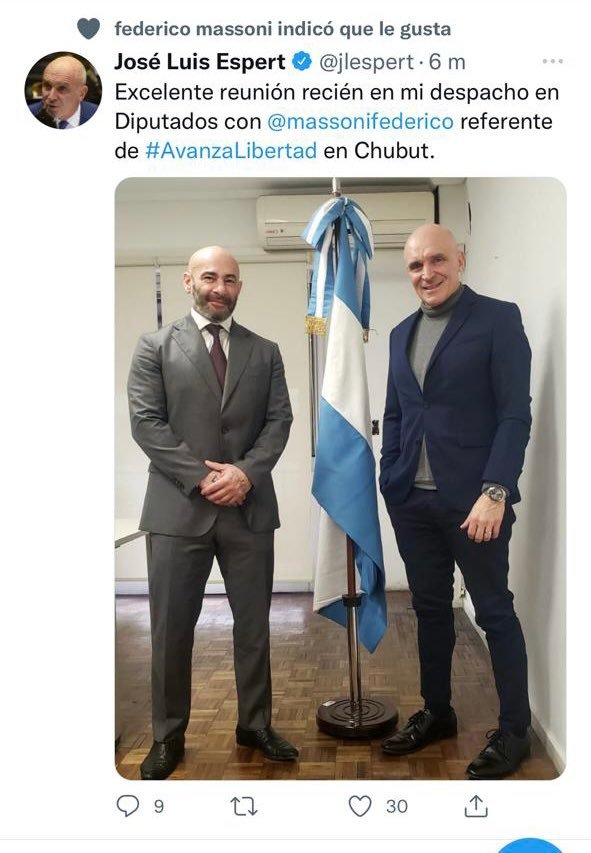 La reunión habría sido positiva y Espert envalentonado realizó una publicación en Twitter donde escribió «Excelente reunión recien en mi despacho en diputados con Federico Massoni referente de #AvanzaLibertad en Chubut».