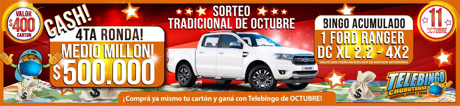 El valor del cartón es de 400 pesos.Este domingo 11 el Telebingo Chubutense pone en juego 800 mil pesos en efectivo distribuidos en cuatro Rondas y da más posibilidades de entregar una camioneta Ford Ranger como premio a Pozo Bingo Acumulado, ya que puede salir entre las bolillas 40 a la 43.