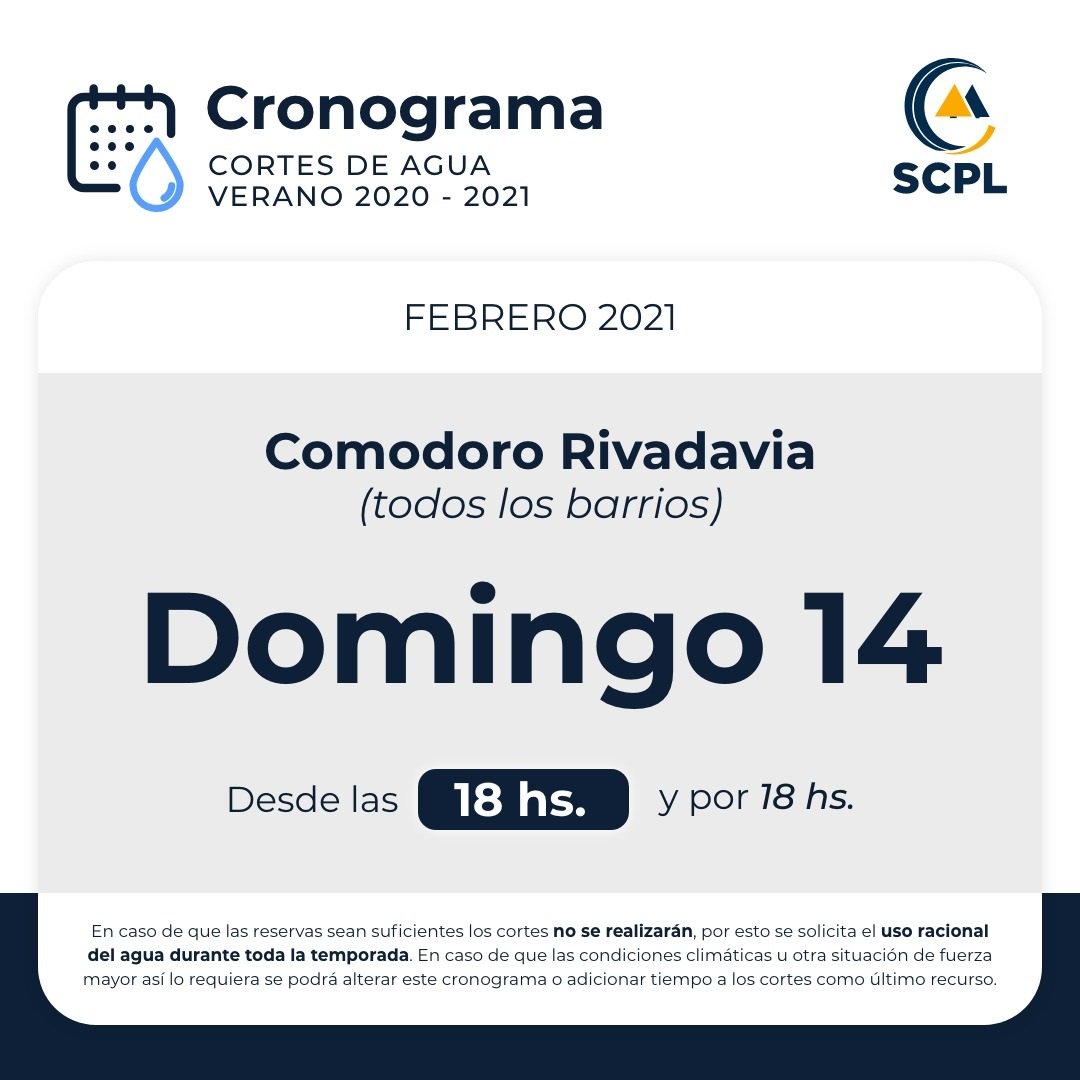 La Sociedad Cooperativa Popular Limitada anunció hoy que dará continuidad al cronograma de cortes de agua en Comodoro con un corte este domingo, que será por 18 horas.