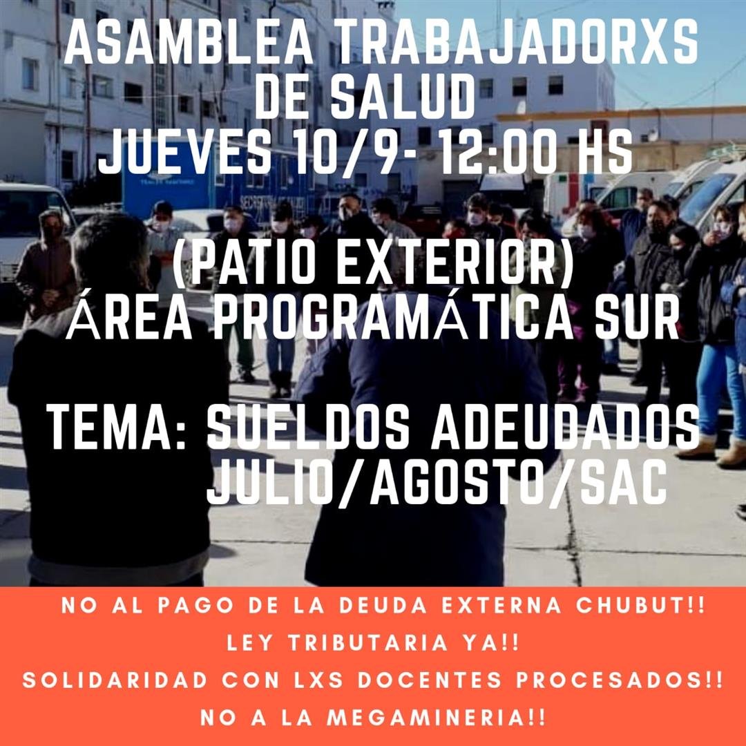 Para dar continuidad al plan de lucha emprendido desde los distintos gremios de trabajadores estatales, este jueves, a las doce del mediodía se llevará a cabo una asamblea en el patio exterior del Área Programática Comodoro.Este martes se conoció también que desde ATE llamaron a un paro de 24 horas para este jueves. La medida es por salarios y aguinaldos adeudados. Según explicaron desde el gremio, adherirán todos los trabajadores del sector estatal. Además, habrá movilizaciones.