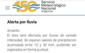 “El área será afectada por lluvias de variada intensidad. Se esperan valores de precipitación acumulada entre 15 y 30 mm, pudiendo ser superados en forma puntual”