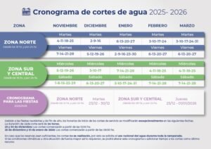Por otro lado, desde el sector explicaron cómo serán los cortes durante las festividades de fin de año, “vamos a sostener los cortes desdoblados por zona, pero cambiaremos algunos horarios y días para cuidar las reservas. De este modo, los martes 23 y 30 de diciembre, se interrumpirá el suministro en la Zona Norte de la ciudad, desde las 12 horas y por un lapso de 24 horas; mientras que, en Zona Sur y Central, se realizarán los cortes los jueves 25 de diciembre y 01 de enero de 2026, desde las 08 horas y por 24 horas”.