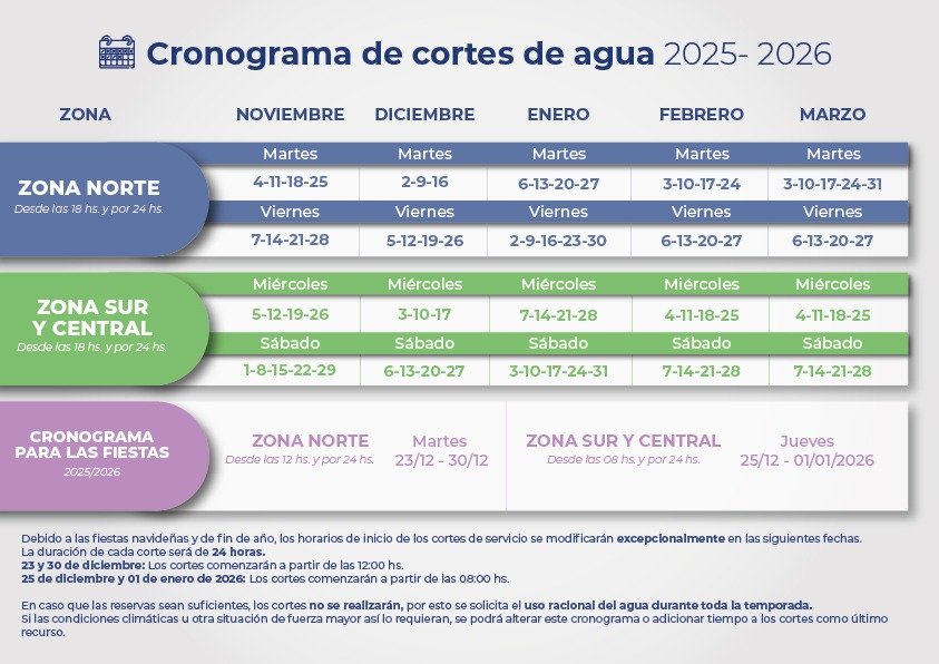 El cronograma dará inicio el sábado 1 de noviembre y tiene previsto cortes de agua con una duración de 24 horas, diferenciados para cada zona de la ciudad, desde noviembre a marzo de 2026, correspondiente al período en que se percibe el consumo más alto de agua, y a su vez, la disminución de las reservas de Puesto La Mata.