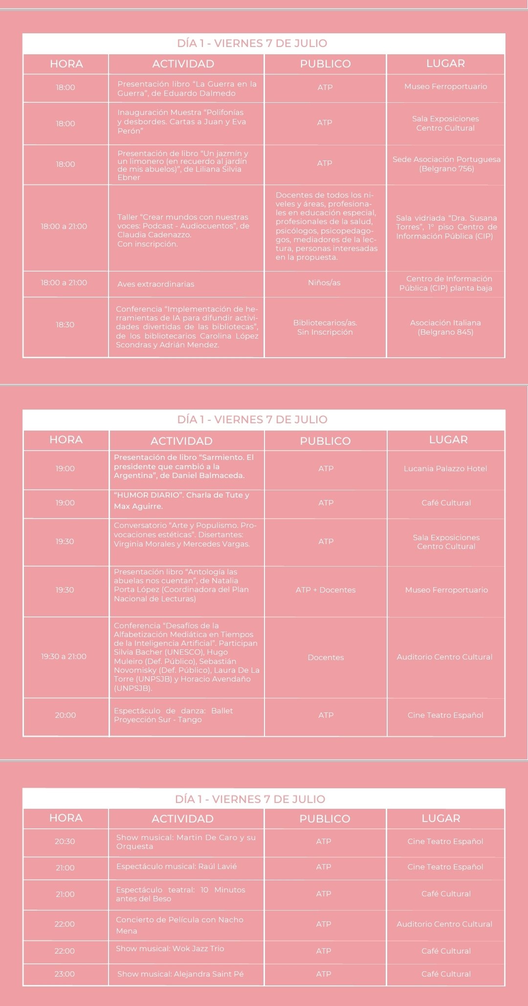 Además, habrá una variedad de stands, editoriales, presentaciones de libros, propuestas para adolescentes, talleres, shows musicales en vivo, conferencias, entre otras iniciativas para todas las edades. Por cuestiones de espacio, algunas charlas tienen un cupo con entrada gratuita anticipada, que ya se puede obtener a través de www.comodoroweb.gob.ar