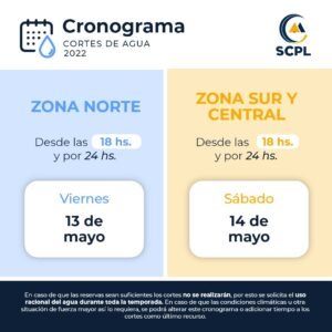 El corte se realizará por zonas y tendrán una duración de 24hs: “A los fines de recuperar los niveles de reservas del Puesto La Mata, se interrumpirá el suministro hoy viernes 13 de mayo, desde las 18 horas y por un lapso de 24 horas, en Zona Norte y el sábado 14, desde las 18 horas y por 24 horas, en las Zonas Sur y Central. ” destaca el comunicado de la SCPL.