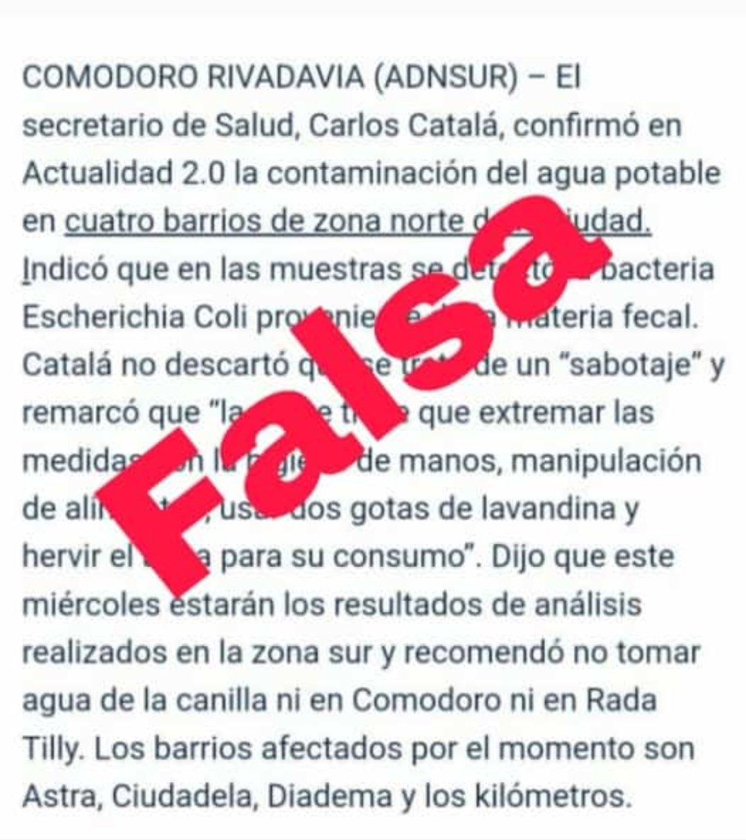 Fake News: advierten sobre un mensaje viral en WhatsApp sobre agua contaminada en Comodoro