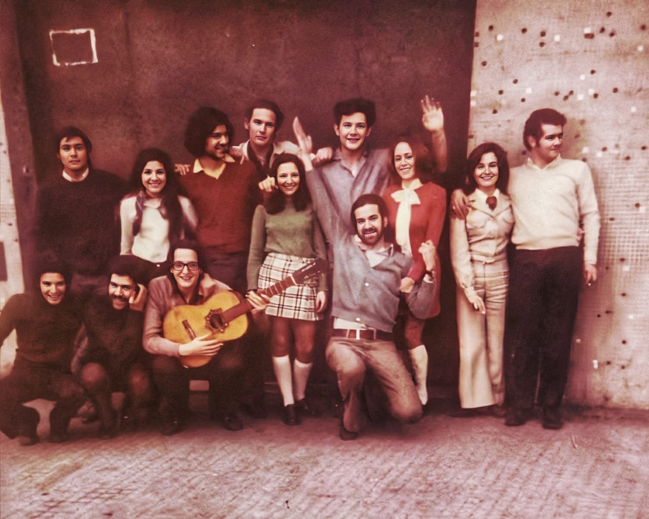 La foto data de 1973, momento en que el ex presidente Néstor Kirchner estudiaba en la ciudad de La Plata. En la imagen posa, guitarra en mano, junto a otros 12 estudiantes oriundos de la provincia de Santa Cruz.