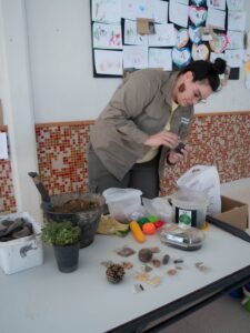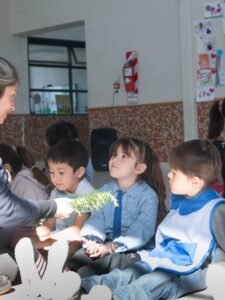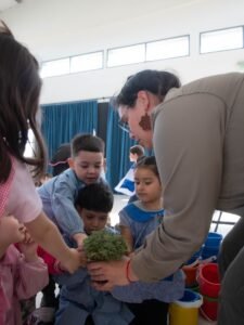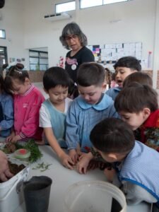 Los chicos, acompañados por sus docentes, plantaron un cajón con hierbas aromáticas mientras repasaban lo aprendido sobre las partes de las plantas, sus nombres y aromas característicos.