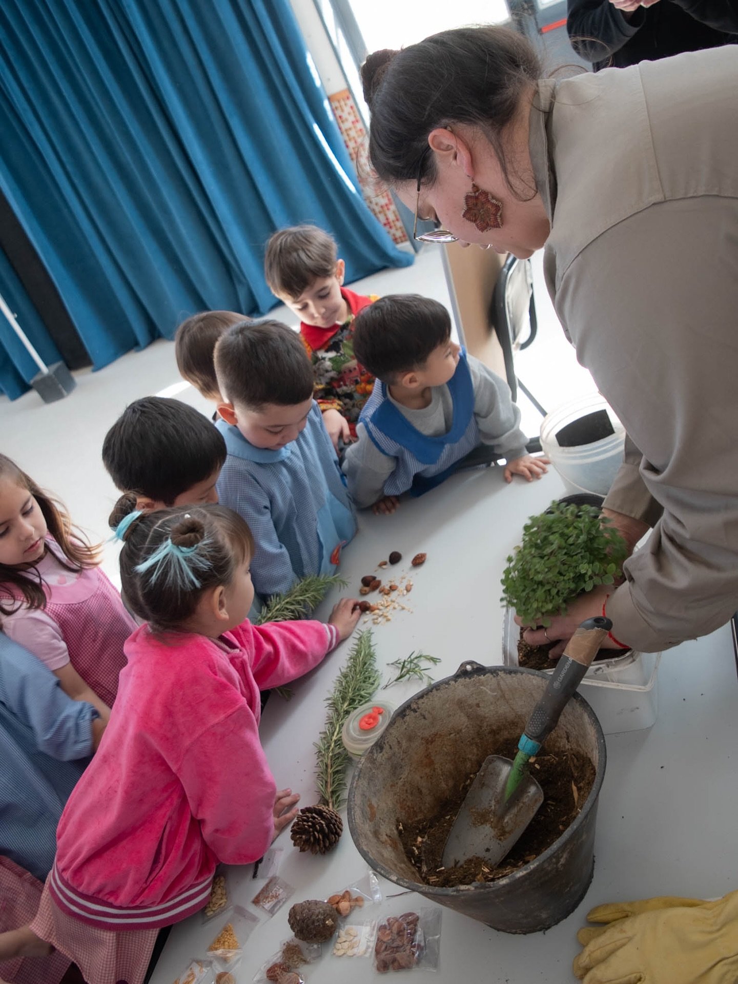 Los chicos, acompañados por sus docentes, plantaron un cajón con hierbas aromáticas mientras repasaban lo aprendido sobre las partes de las plantas, sus nombres y aromas característicos.