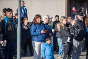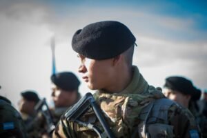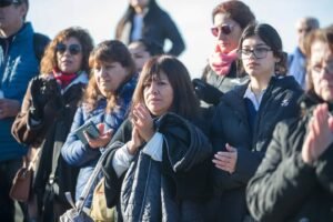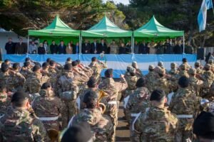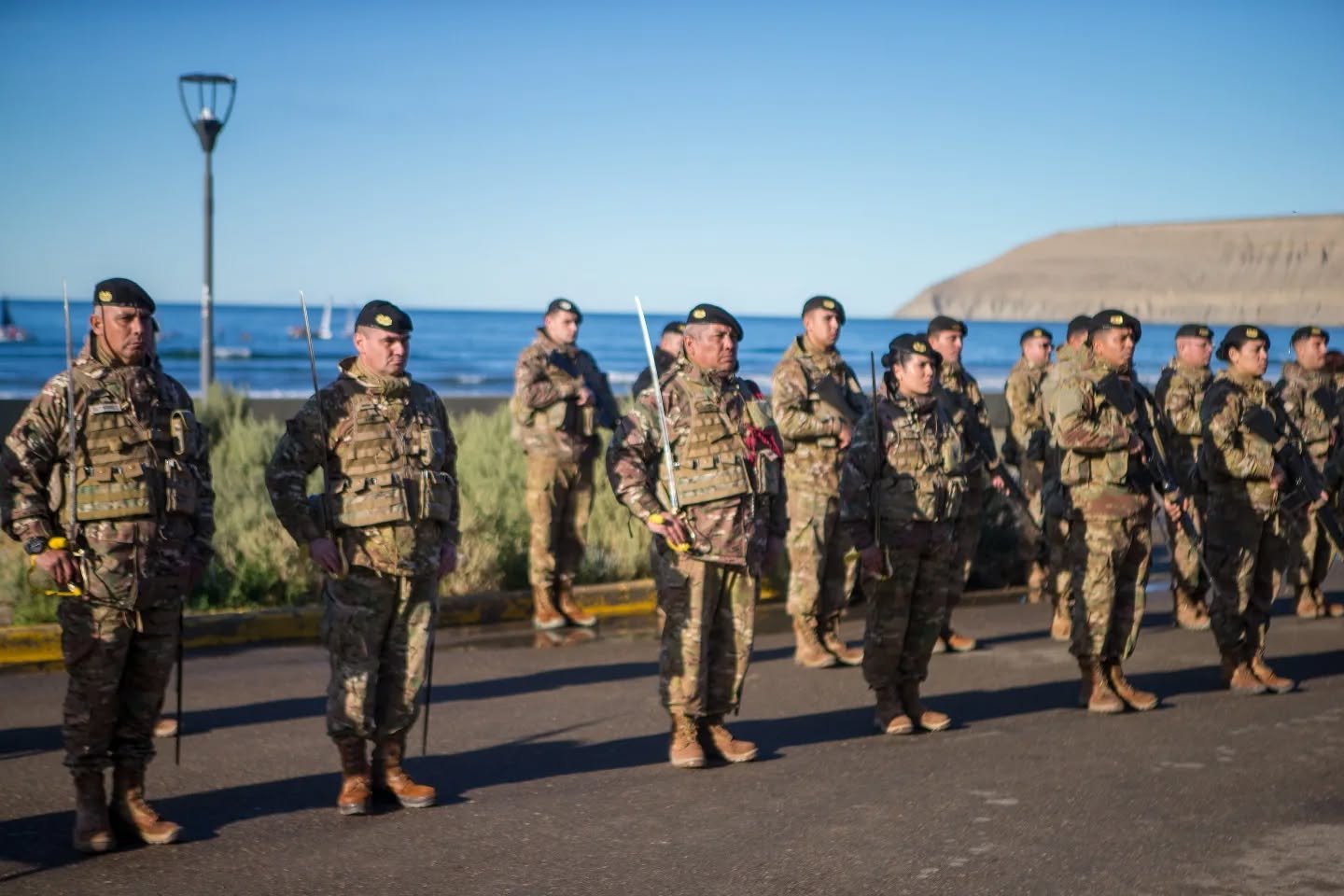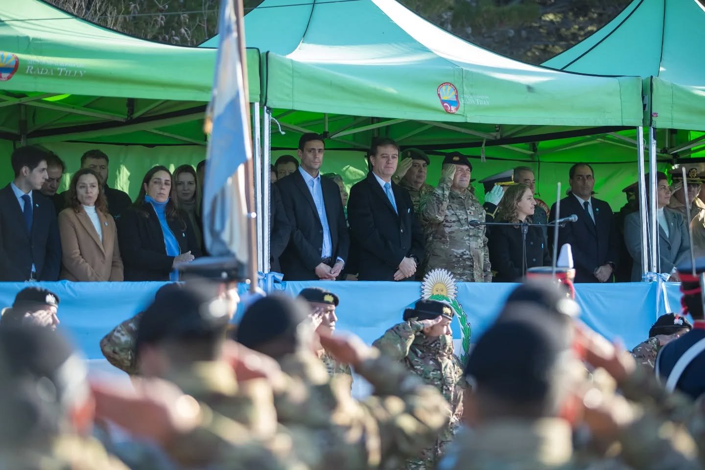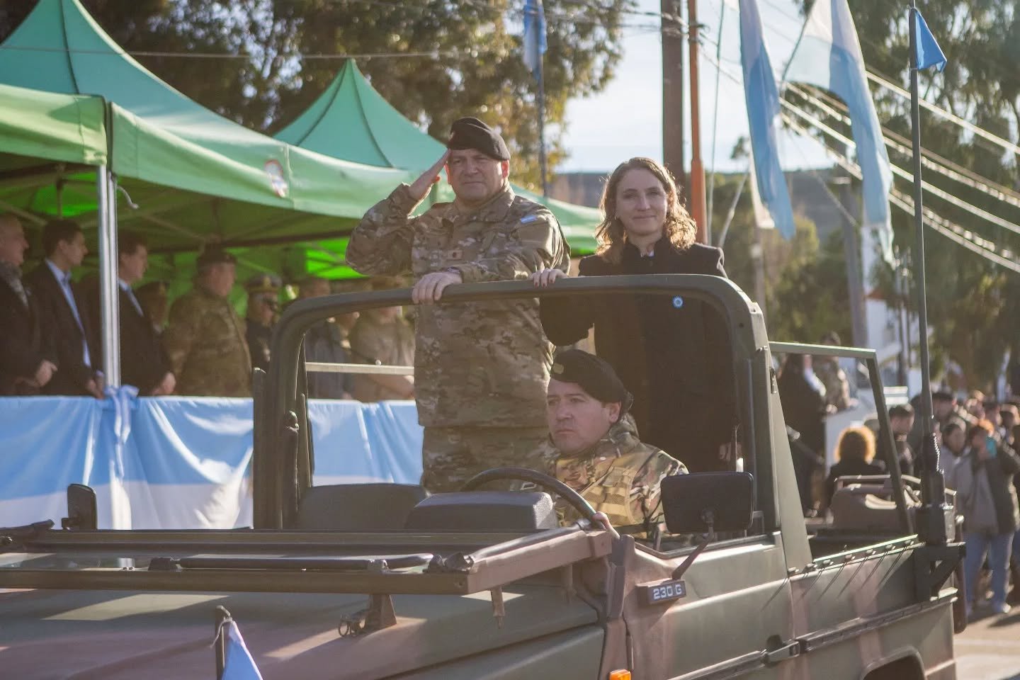 Luego de la invocación religiosa a cargo del capellán Adrián Torres, se llevó a cabo uno de los momentos más esperados: la jura de fidelidad a la Bandera Nacional por parte de los cadetes de quinto año del Liceo Militar General Roca y soldados voluntarios de la Guarnición Ejército Comodoro Rivadavia. La fórmula fue pronunciada por el comandante de la IX Brigada Mecanizada, coronel Claudio Cervigni, en una instancia solemne que reafirma el compromiso de servicio y amor a la Patria.