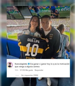 Desde Brasil, donde había competido en el Gran Premio de Interlagos, Colapinto siguió el partido y, una vez finalizado, se sumó a los festejos en redes sociales, pero lo que más llamó la atención fue su reacción a un posteo de la cuenta oficial de Boca, que mostraba a Dua Lipa en La Bombonera junto a Juan Román Riquelme.