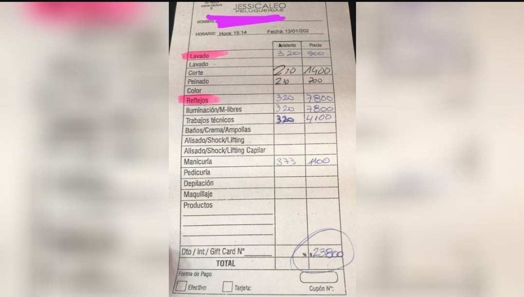 El pasado martes, el ticket por los servicios en una peluquería de Pinamar causó revuelo y a poco de ser compartido en las redes, se volvió viral. Según el detalle de la cuenta, los gastos fueron $7800 por reflejos, $7800 por iluminación, $900 por el lavado, $1400 por la manicura, $1400 por el corte, $700 por el peinado y $ 4100 por “trabajos técnicos”. El total, $23.800.