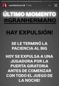 Pero eso no es todo. Del Moro reveló que «se le terminó la paciencia al Big», y que «hoy se expulsa a una jugadora por la puerta giratoria antes de comenzar con todo el juego de la noche».