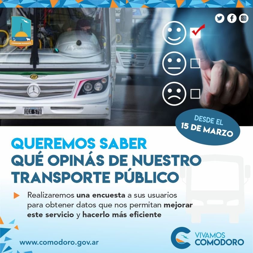 Cualquier vecino podrá acceder a las preguntas que calificarán y evaluarán el sistema de trasporte público de Comodoro por los propios usuarios. Para ello se deberá ingresar a la página web https://www.comodoro.gov.ar/encuesta-de-opinion-transporte-publico-de-pasajeros/ y sin la necesidad de realizar un registro, se podrá opinar de manera anónima.