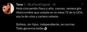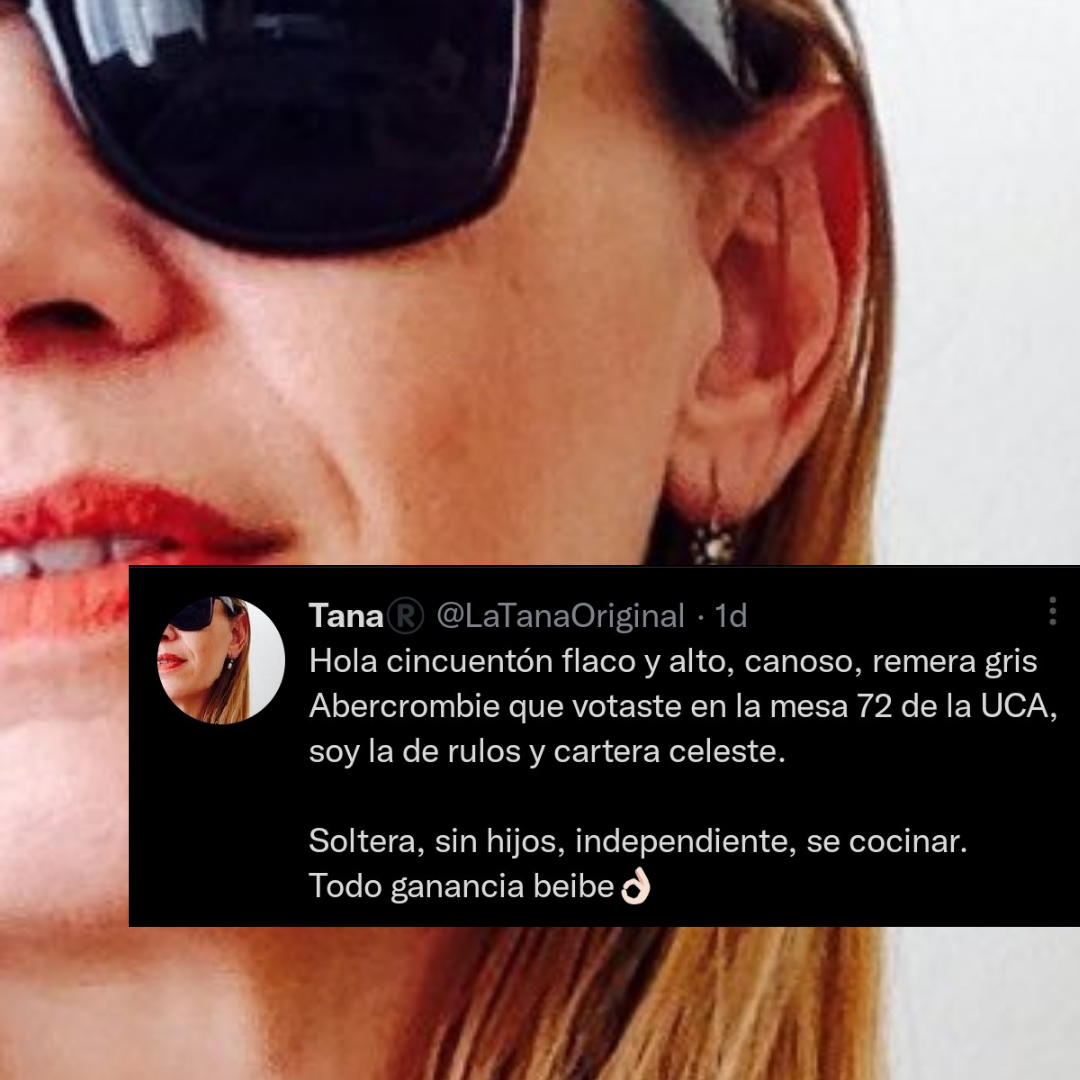 “Hola cincuentón, flaco y alto. Canoso, remera gris Abercrombie que votaste en la mesa 72 de la UCA. Soy la de rulos y cartera celeste”, se animó a expresar en su cuenta esta mujer, con este tuit inicial.