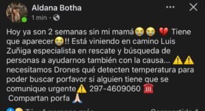 Aldana Botha, hija de Juana, publicó un mensaje en redes sociales donde expresó la angustia por el paso del tiempo y reclamó más herramientas para avanzar con la búsqueda. “Hoy ya son 2 semanas sin mi mamá. Tiene que aparecer”, escribió, y confirmó que el especialista en rescate Luis Zuñiga viaja a la ciudad para sumarse a los rastrillajes.