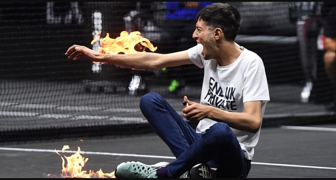 Según detalló el medio británico The Mirror, el manifestante ingresó con un objeto similar a una botella a la cancha y prendió fuego en el campo, justo antes de incendiar su propio brazo. La remera que portaba buscaba generar conciencia sobre el efecto de los viajes aéreos en el cambio climático. Segundos más tarde, tres agentes de seguridad lo cargaron de los hombros y las piernas para retirarlo del recinto.