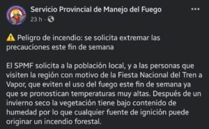 El SPMF solicita a la población local, y a las personas que visiten la región con motivo de la Fiesta Nacional del Tren a Vapor, que eviten el uso del fuego este fin de semana ya que se pronostican temperaturas muy altas.Después de un invierno seco la vegetación tiene bajo contenido de humedad por lo que cualquier fuente de ignición puede originar un incendio forestal».