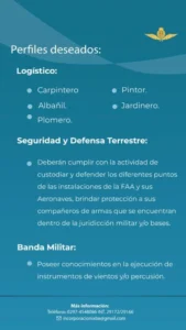 - Banda militar: aspirantes con conocimientos en instrumentos de viento o percusión.