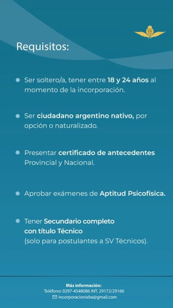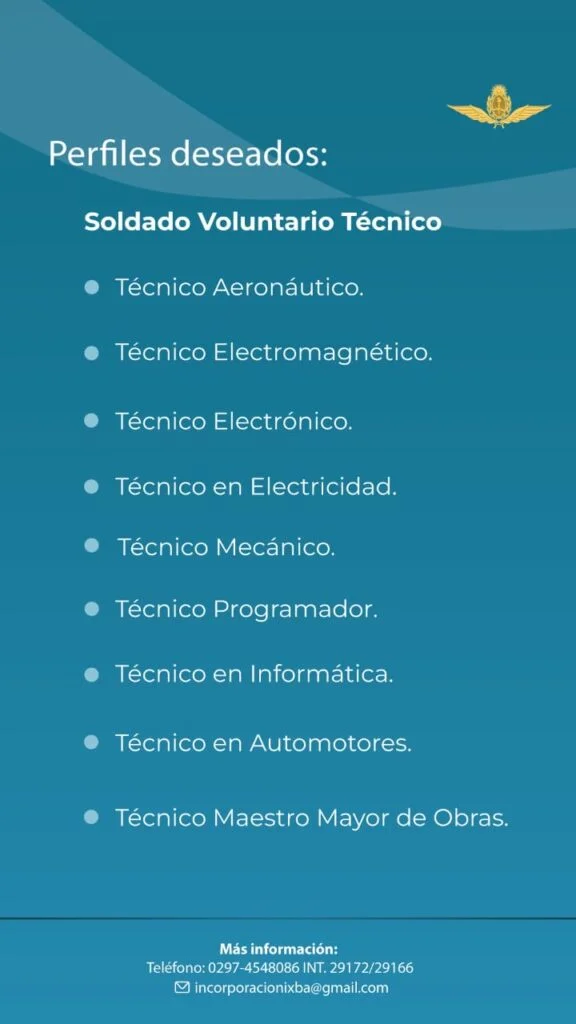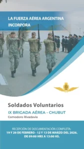 La Fuerza Aérea Argentina abrió la inscripción para Soldados Voluntarios en Comodoro Rivadavia, destinada a jóvenes solteros, argentinos nativos o naturalizados, de entre 18 y 24 años, para cubrir perfiles técnicos, logísticos y operativos.
