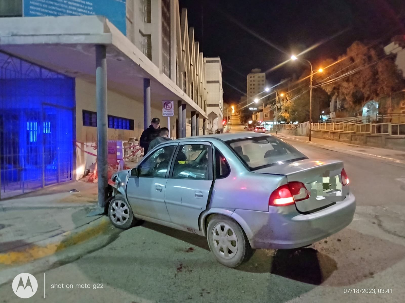 En la madrugada de hoy martes 18 de julio, un vehículo Chevrolet modelo Corsa, color gris, colisionó contra una columna cementada de la iglesia catedral en San Martín y calle Belgrano, en el barrio Centro de Comodoro Rivadavia.
