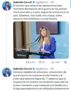 La portavoz presidencial, Gabriela Cerruti, atribuyó la inflación al «peor momento del impacto de la guerra» en Ucrania en los precios internacionales y a la sequía que azota al país.