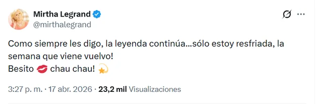 Alrededor de las 15 hs de este viernes, Legrand escribió un mensaje en su cuenta oficial de X, contando la razón detrás de la cancelación de las grabaciones de su ciclo en El Trece: “Como siempre les digo, la leyenda continúa… sólo estoy resfriada, la semana que viene vuelvo!”, informó.
