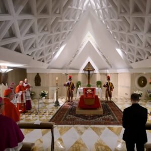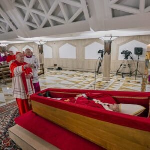 El Vaticano hizo públicas este martes las primeras imágenes del féretro del papa Francisco, en tanto que también detalló el programa de los funerales, que el sábado 26 tendrá su punto culminante. El ataúd del Sumo Pontífice está dispuesto en la Capilla de Santa Marta. Se trata de un simple ataúd de madera abierto sin el catafalco, en el que el Papa descansa vestido con la mitra, la sotana blanca, la casulla roja y el palio blanco. En sus manos sostiene el rosario.