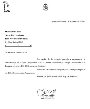 La Legislatura de la provincia sigue dividiéndose y ahora Tatiana Goic, la diputada que responde al gremio Camioneros, conformó su propio bloque unipersonal. Con este panorama en curso, ahora el palacio legislativo quedará conformado por siete bloques.La diputada Tatiana Goic envió en las últimas horas una nota al presidente de la Legislatura, Ricardo Sastre, para informarle sobre la decisión de conformar un unibloque. Con este panorama en curso, ahora habrá siete bloques: Chubut al Frente, Frente de Todos, Chubut Unido, UCR, Integrando Chubut, Visión Peronista y el unibloque de Goic, el partido Cultura, Educación y Trabajo.