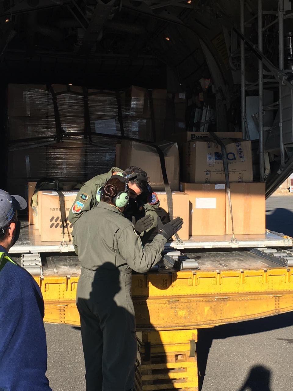 El avión Hercules arribo a la zona en la mañana de este sábado con insumos médicos, pastillas potabilizadoras de agua, barbijos y barbijos quirurgicos, guantes, equipos de protección personal y medicamentos para que se utilizados entre las autoridades medicas, y las personas de la comarca andina donde el incendio destruyo distintas parte localidades