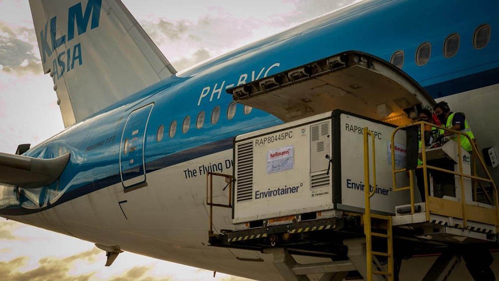 Las 96.000 dosis fueron cargadas en dos contenedores Envirotainers RAP E1 de temperatura controlada. El rango de temperatura es +2 +8°C.