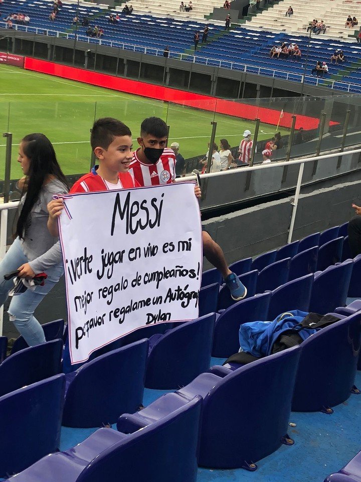 La bandera es una de las tantas muestras de afecto de los hinchas guaraníes al capitán del seleccionado argentino en el marco del partido de Eliminatorias Sudamericanas en el que Paraguay y el campeón de América igualaron 0-0. Para los locales, el encuentro contra la Argentina significaba mucho más que un enfrentamiento por los puntos: era la posibilidad de ver al mejor jugador del mundo en vivo y en directo. Por eso no llamó la atención que en Asunción se superara largamente el aforo permitido y que la ocupación del estadio de la APF estuviera más cerca del 80 que del 50 por ciento.