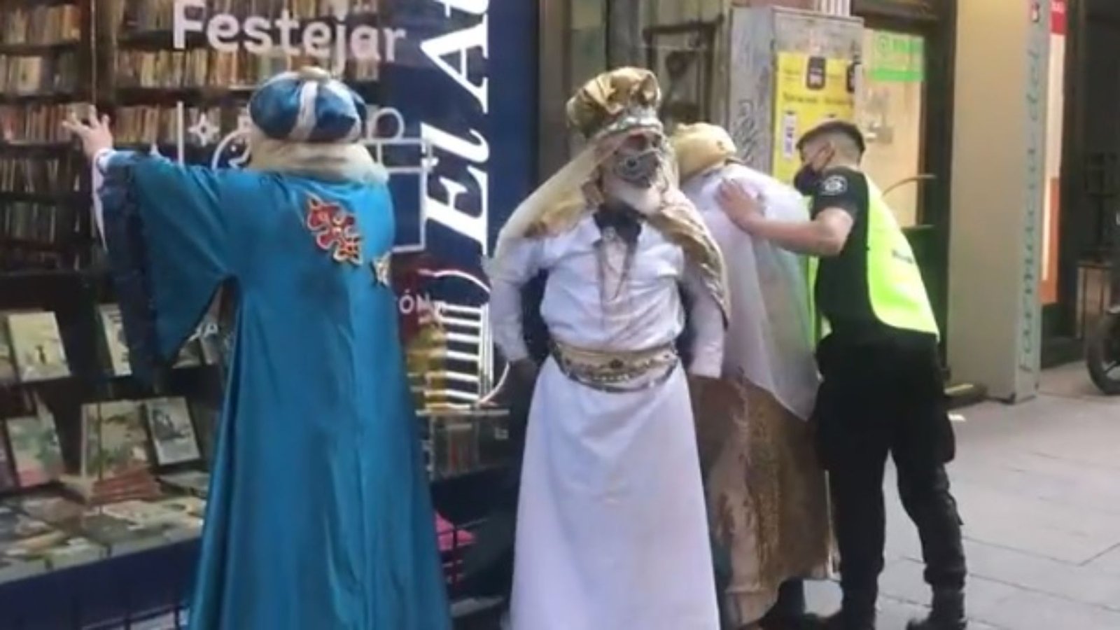 Fue así que la víctima dio aviso a la Policía y los tres hombres vestidos de Reyes Magos fueron puestos contra la vidriera de una librería para ser requisados en forma minuciosa.
