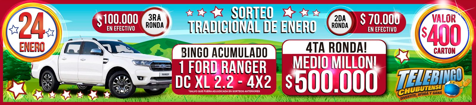 Además, una camioneta Ford Ranger doble cabina a Premio Pozo Bingo Acumulado.El domingo 24 de enero a partir de las 19:00 horas, desde la Sala de Sorteos de Lotería del Chubut, el Telebingo Chubutense sortea 500 mil pesos en la Cuarta Ronda a Bingo, y a Premio Pozo Bingo Acumulado una camioneta Ford Ranger doble cabina. El valor del cartón es de 400 pesos.
