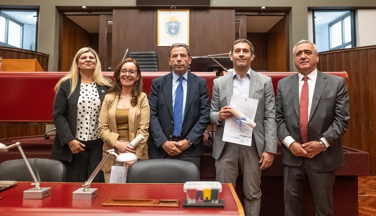 En un acto desarrollado en la Legislatura del Chubut, Juan Pablo Luque recibió su diploma como diputado nacional electo de manos del Juez de la Cámara Federal de Apelaciones de Comodoro Rivadavia, Dr. Javier Leal de Ibarra; el juez federal, Dr. Hugo Sastre; y la ministra del Superior Tribunal de Justicia, Dra. Camila Banfi,