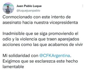 Luego, en horas de esta mañana en conversación con el panel de “Sobran los Motivos”, de LaCienPuntoUno, agregó sentirse conmovido y sorprendido por el intento de magnicidio a la vicepresidenta Cristina Fernández.