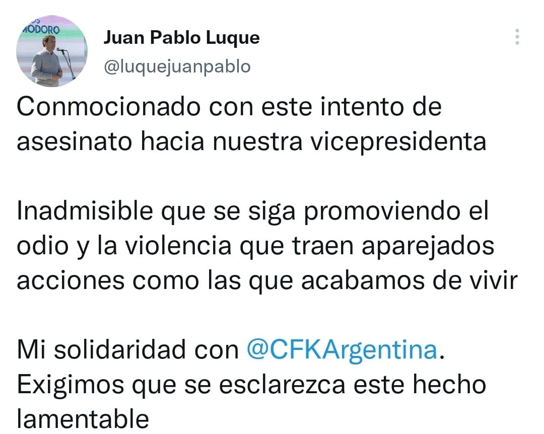 Horas después del intento de asesinato a la Vicepresidenta Cristina Fernández en la noche de este jueves, el Intendente de Comodoro Rivadavia expresó su conmoción por lo sucedido en el barrio porteño de Recoleta a través de su cuenta oficial de Twitter.