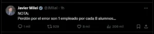 El Presidente Javier Milei publicó un tuit en el que retoma una entrevista en la que el rector de la Universidad Nacional de Rosario (UNR), Franco Bartolacci, indicó que la institución cuenta con 85.000 alumnos y 10.500 empleados. En la publicación, Milei interroga “¿8 empleados por cada alumno? Se los dejo para pensar…”, cuando el cálculo correcto es 1 empleado cada 8 alumnos.