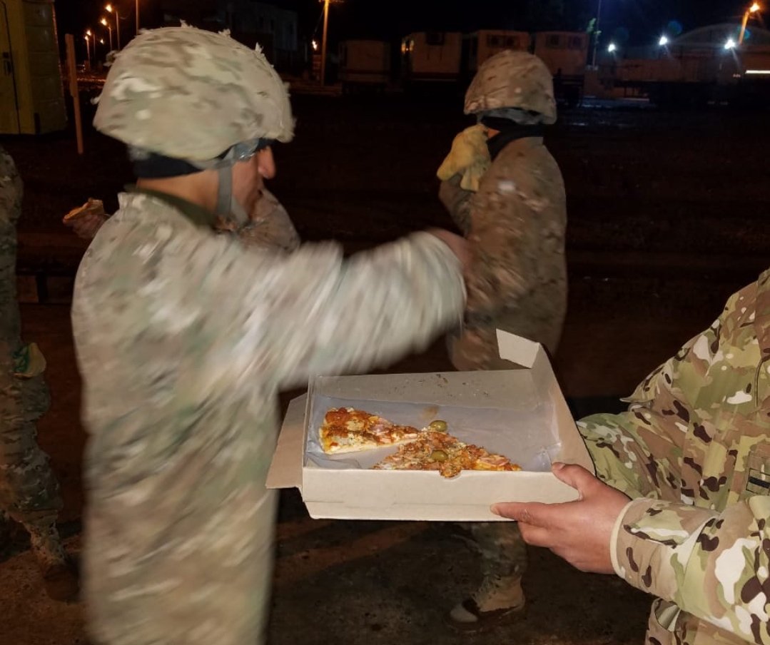 Según publicó Tveo Comodoro alrededor de las 20hs de este miércoles un grupo de vecinos del barrio Los Arenales agradecieron con pizzas, luego de una jornada de duro trabajo, a militares de la IX Brigada Mecanizada abocados a la instalación de un puente en el ingreso al barrio.