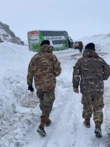 El personal del Ejército Argentino de Guarnición Ejército Comodoro Rivadavia y Guarnición Ejército Sarmiento se desplegaron en todas las zonas de emergencia señaladas por Defensa Civil debido al impacto del temporal de nieve en la región.