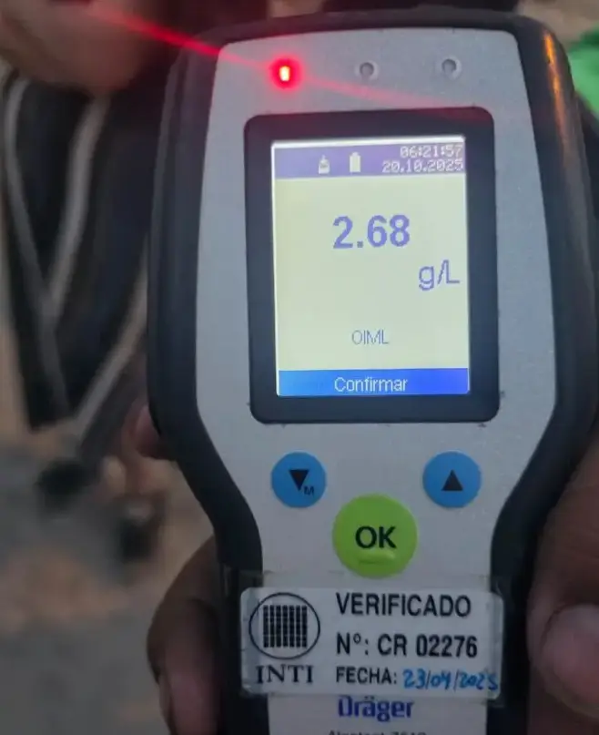 Ante esta situación, se solicitó la intervención de Tránsito Municipal, que realizó el test de alcoholemia correspondiente. El resultado fue positivo: 2,68 gramos de alcohol por litro de sangre, un valor muy por encima del límite permitido.