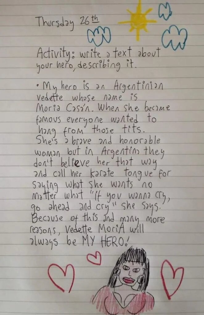 Según se puede leer, la tarea constaba de escribir un texto sobre un héroe y describirlo y la nena habló sobre la exvedette. «Mi héroe es una vedette Argentina llamada Moria Casán», comienza la niña y agrega divertida: «Cuando ella se convirtió en famosa todos querían ‘colgarse de sus tet…'».