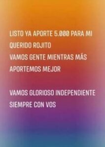 «Listo, ya aporté $5.000 para mi querido Rojito. Vamos gente, mientras más aportemos mejor. Vamos Gloriso Independiente, siempre con vos», escribió el joven en la red social y rápidamente llegó la respuesta de su ex.