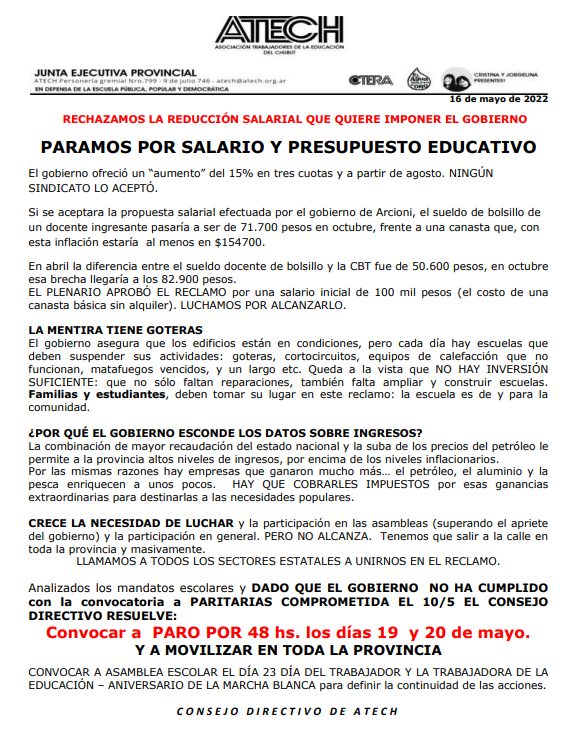 La Asociación de Trabajadores de la Educación de Chubut irá nuevamente al paro este jueves 19 y viernes 20 de mayo en reclamo de una mejor propuesta salarial.